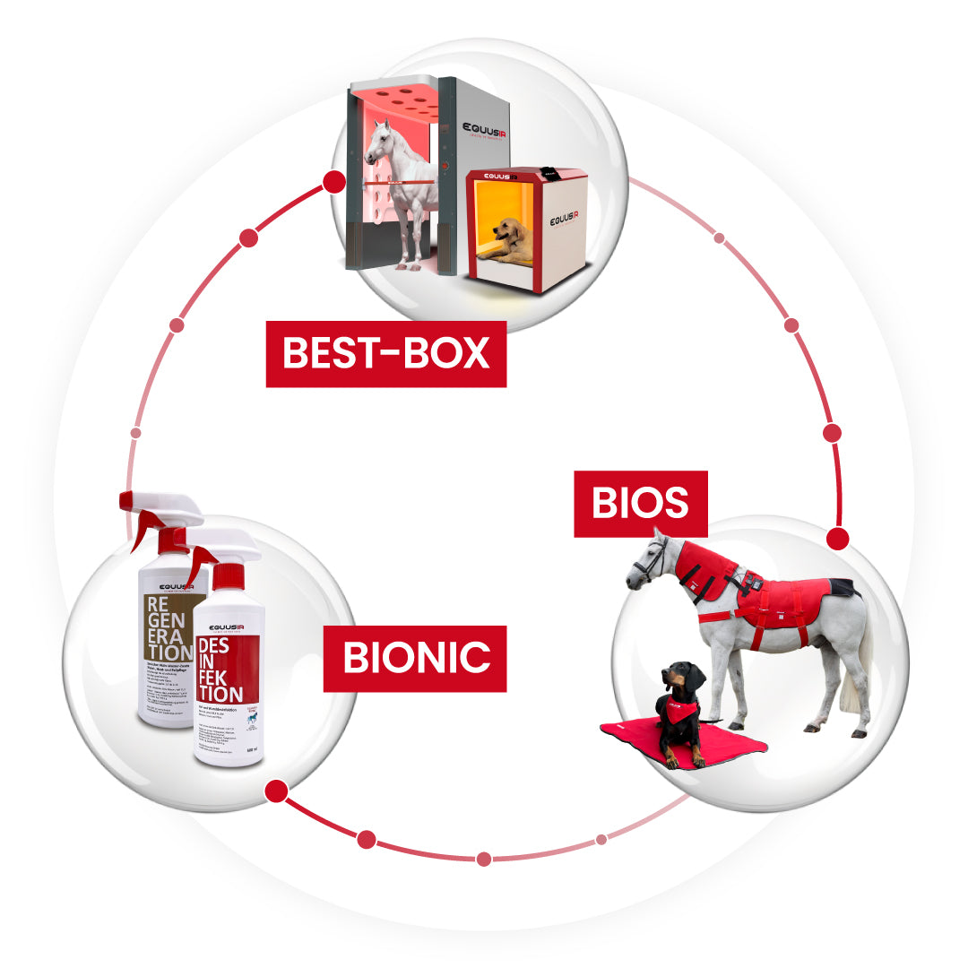 Unsere BIOS- und BIONIC-Produkte bieten hochwirksame Lösungen zur Pflege und Regeneration für Pferde und Hunde und vervollständigen das EQUUSYSTEM komplementär zur BEST-BOX.