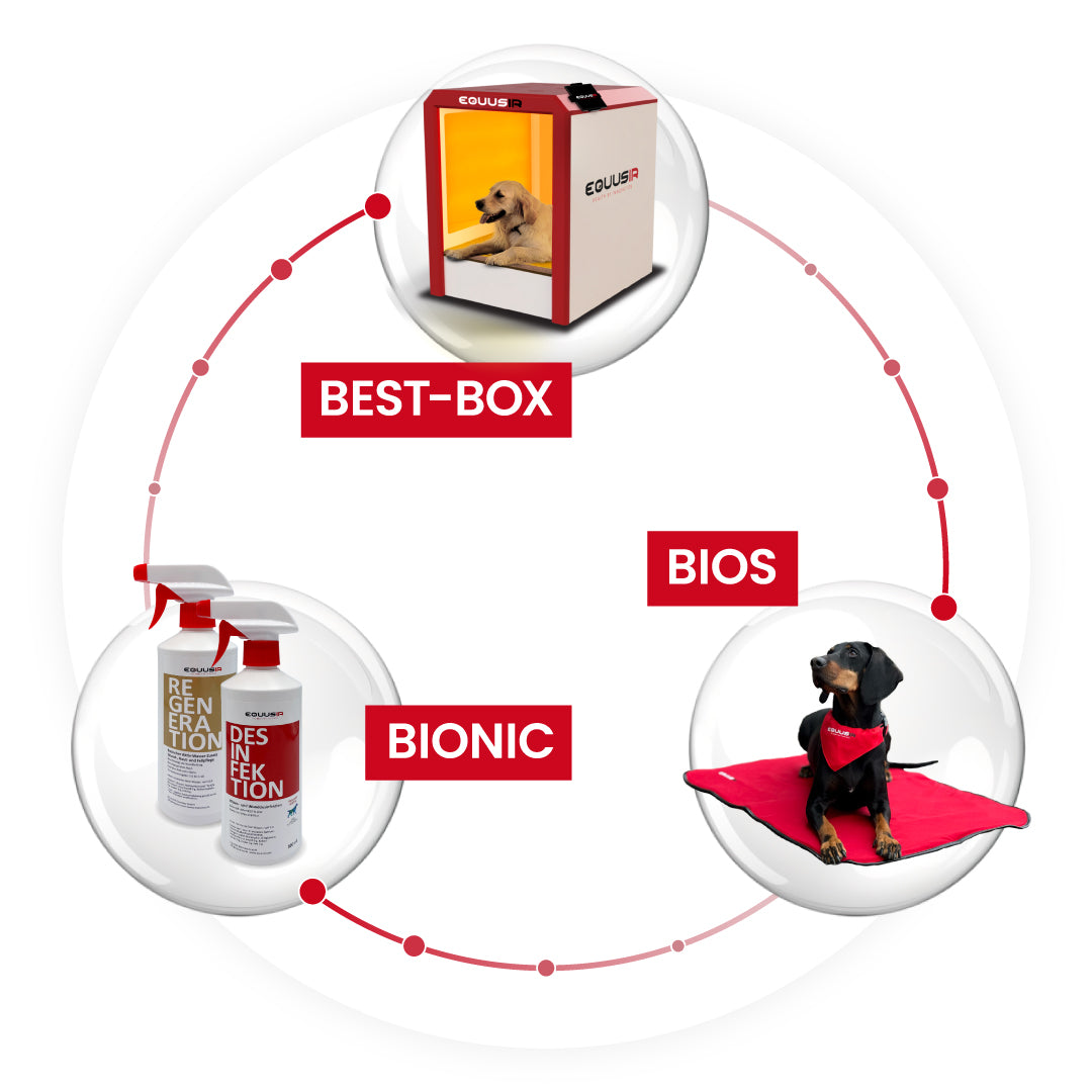 The EQUUSIR BEST-BOX is a high-tech product based on cutting-edge light, neuro, and heat technology. It is used in clinics, rehabilitation centers, breeders, and by certified EQUUSIR therapists to specifically support regeneration, metabolism, and cell activation. For professionals: As a veterinarian, therapist, or trainer, you can purchase the BEST-BOX and integrate it into your work. For dog owners: Book a session with an EQUUSIR partner near you and experience the effects firsthand.