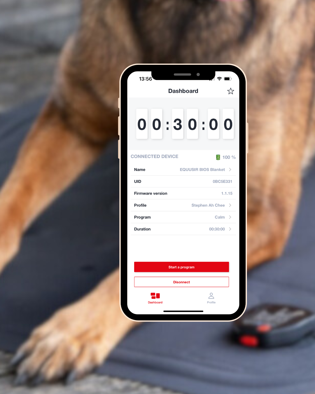 With the EQUUSIR BIOS App, you can effortlessly control the BIOS-SYSTEM for your dog. Activate programs immediately when your dog lies down on the blanket and conveniently control the applications remotely, even while driving. This gives you the opportunity to offer your dog the optimal balance of its vital functions 24/7 - at the touch of a button. Efficient management of multiple BIOS-SYSTEMS guarantees time-saving and effective use.